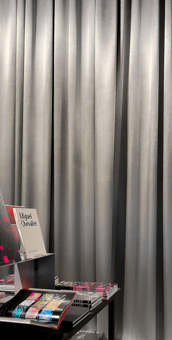 Un rideau monumental métallique de 6 mètres de hauteur structure l’espace, devenant un élément fort à la fois fonctionnel et esthétique.